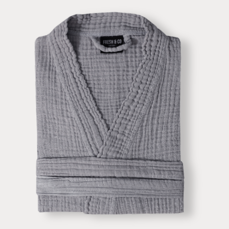 Geniet van ultiem comfort met de Badjas Mousseline Katoen van Fresh and Co. Gemaakt van 100% ademend katoen in mousseline weving: lichtgewicht, extra zacht en soepel. Ideaal voor na het douchen, in de sauna of om thuis te ontspannen.