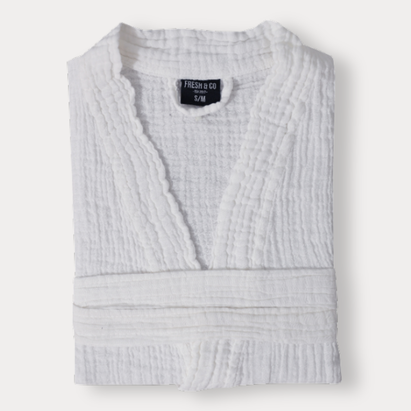 Geniet van ultiem comfort met de Badjas Mousseline Katoen van Fresh and Co. Gemaakt van 100% ademend katoen in mousseline weving: lichtgewicht, extra zacht en soepel. Ideaal voor na het douchen, in de sauna of om thuis te ontspannen.