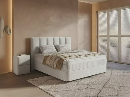 Creëer een hotel chique slaapkamer met de Boxspring met Opbergruimte - Linea Beige. Deze luxueuze boxspring in elegante beige Nano-stof combineert verfijnd design met slimme functionaliteit. Het verticale hoofdbord met strakke belijning zorgt voor een moderne uitstraling en maakt dit model tot de perfecte keuze voor wie stijl en praktisch gemak wil samenbrengen.