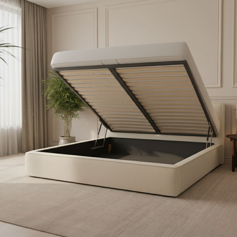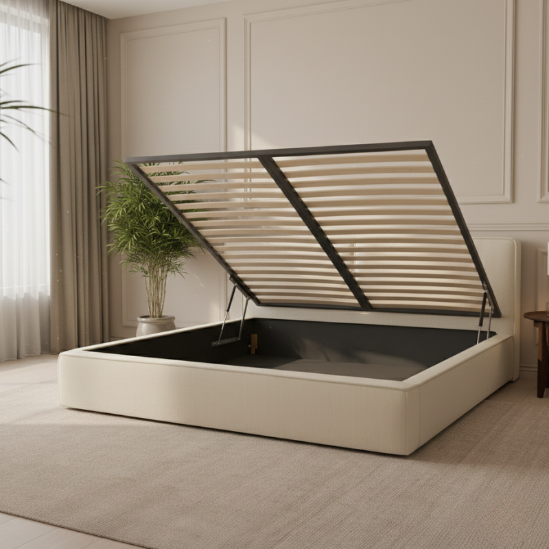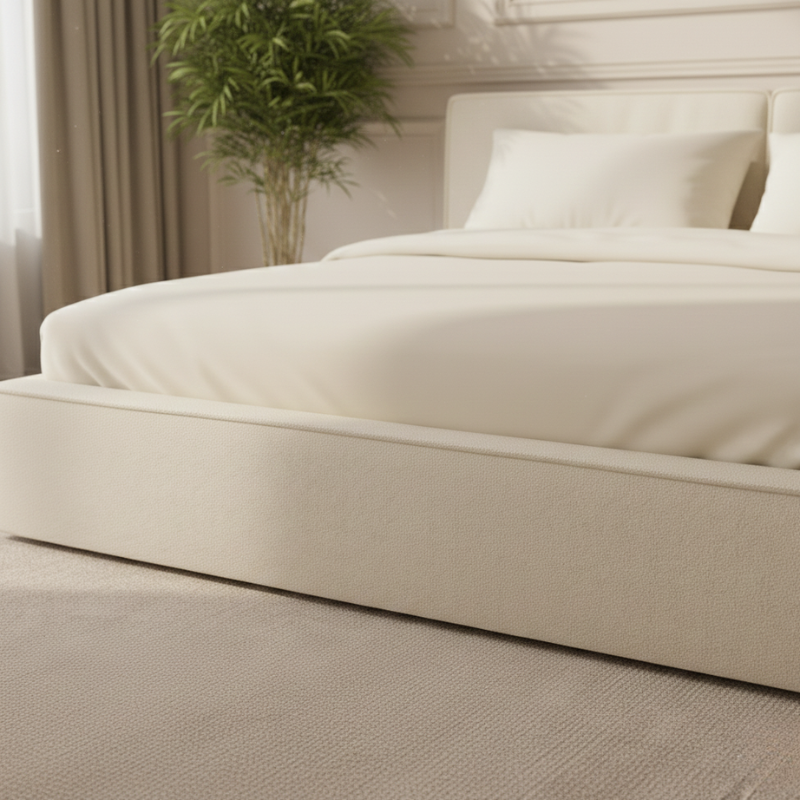 Geniet van stijl, comfort én slimme functionaliteit met de Boxspring met Opbergruimte – Salerno. Deze moderne boxspring in elegante crème bouclé stof geeft je slaapkamer een luxe uitstraling en biedt tegelijk een zee van verborgen opbergruimte. Perfect voor wie graag georganiseerd en sfeervol wil wonen zonder aan comfort in te boeten.