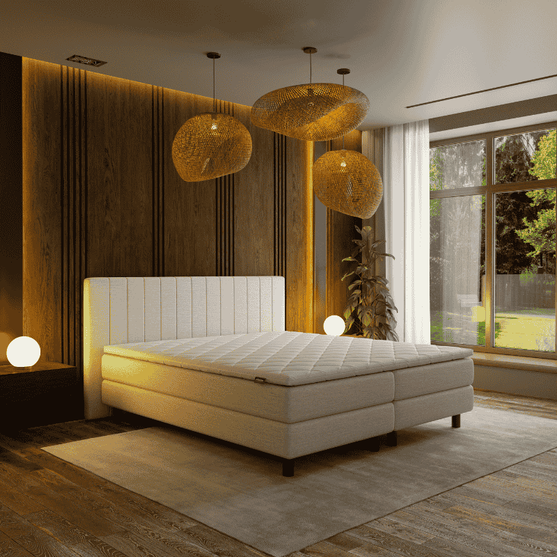 Met de Boxspring Hotel – Beam haal je een bed in huis dat luxe, comfort en design perfect combineert. Je geniet van hoogwaardige materialen, een unieke uitstraling en een bed dat volledig aansluit op jouw wensen. De ruime instaphoogte, het brede hoofdbord en het comfort van het pocketveringmatras zorgen ervoor dat je elke ochtend uitgerust wakker wordt.