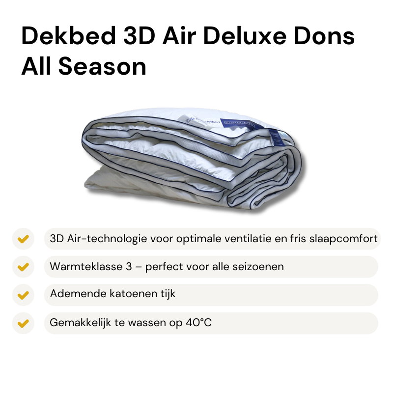 Ervaar luxueus slaapcomfort het hele jaar door met het Dekbed 3D Air Deluxe Dons – All Season. Dit hoogwaardige donsdekbed combineert de natuurlijke zachtheid van eendendons met de veerkracht van veren, waardoor je geniet van ultieme isolatie én ademend comfort. Het resultaat: een heerlijk licht en volumineus dekbed dat zich soepel om je heen vormt en je lichaam altijd op de juiste temperatuur houdt.