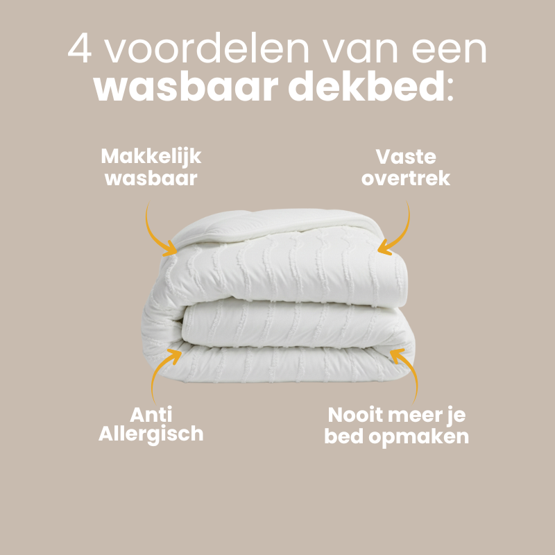 Je kiest voor een stijlvol, onderhoudsvriendelijk dekbed dat je slaaproutine vereenvoudigt. Geen losse overtrekken meer, altijd een verzorgd bed en een aangename warmte het hele jaar door.