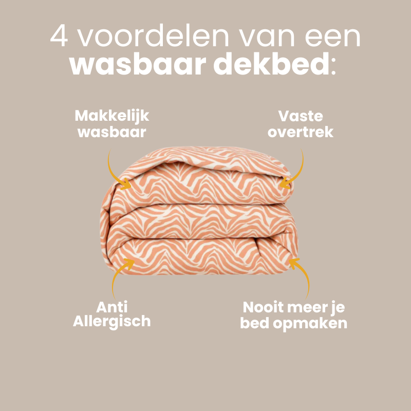 Het dekbed is gemaakt van hoogwaardige microvezel, zowel de tijk als de vulling. Hierdoor voelt het dekbed licht en soepel aan en droogt het snel na het wassen. Je kunt zowel het dekbed als de kussensloop wassen op 40°C, ook zijn deze geschikt voor de droger.