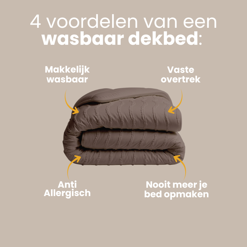 Je kiest voor een stijlvol, onderhoudsvriendelijk dekbed dat je slaaproutine vereenvoudigt. Geen losse overtrekken meer, altijd een verzorgd bed en een aangename warmte het hele jaar door.