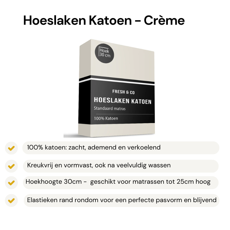 Het Hoeslaken Katoen - Creme is ideaal voor iedereen die een zacht en isolerend hoeslaken zoekt. Door het elastiek rondom blijft het hoeslaken stevig op zijn plek, zelfs bij veel draaien in bed. Perfect voor dagelijks gebruik en geschikt voor zowel een- als tweepersoonsmatrassen.