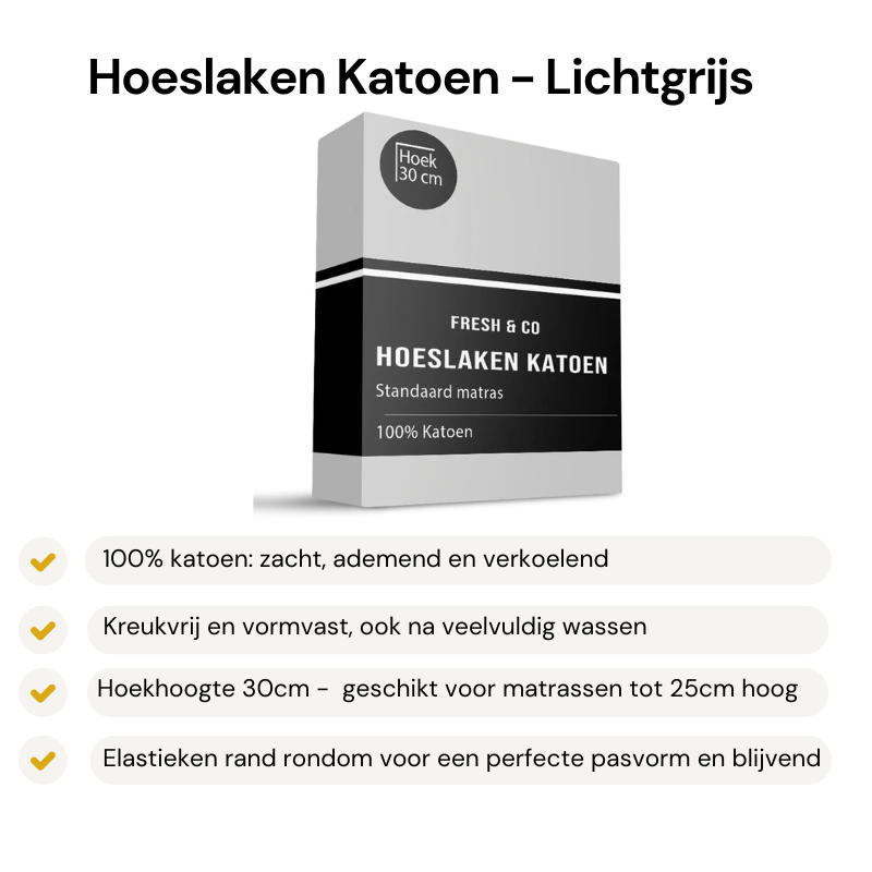 Het Hoeslaken Katoen - Lichtgrijs - Verkoelend is ideaal voor iedereen die het snel warm heeft in bed of op zoek is naar extra frisheid tijdens de zomer. Door het elastiek rondom blijft het hoeslaken stevig op zijn plek, zelfs bij veel draaien in bed. Perfect voor dagelijks gebruik en geschikt voor zowel een- als tweepersoonsmatrassen.