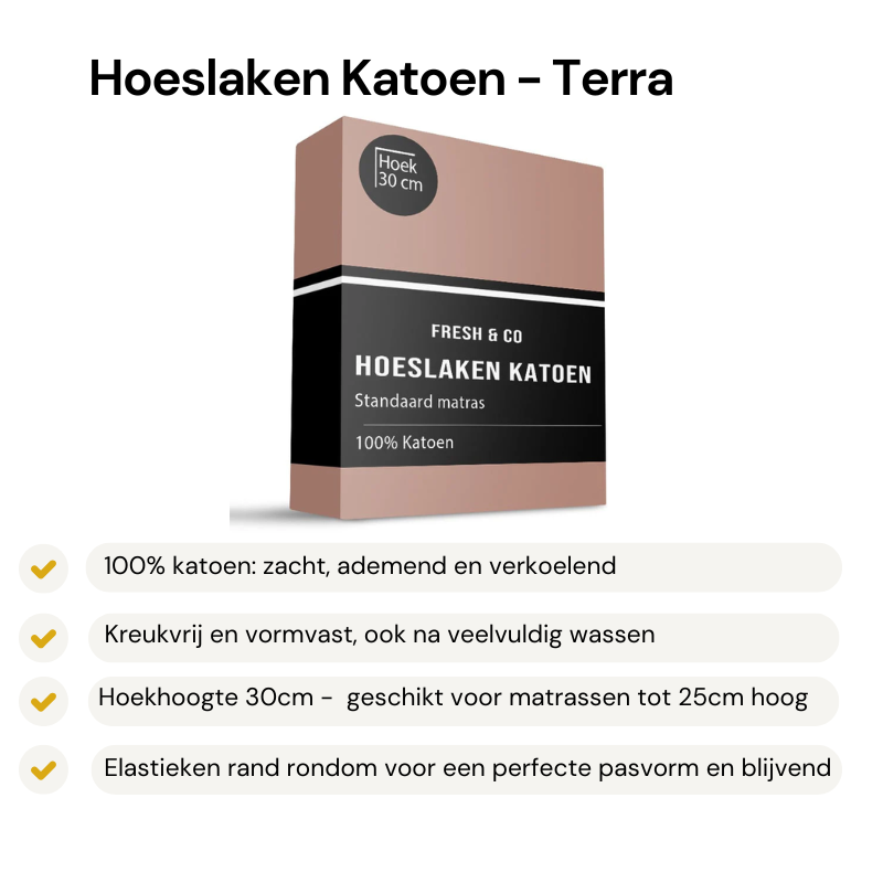 Het Hoeslaken Katoen - Terra - Verkoelend is ideaal voor iedereen die het snel warm heeft in bed of op zoek is naar extra frisheid tijdens de zomer. Door het elastiek rondom blijft het hoeslaken stevig op zijn plek, zelfs bij veel draaien in bed. Perfect voor dagelijks gebruik en geschikt voor zowel een- als tweepersoonsmatrassen.