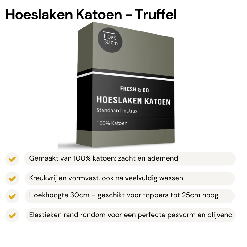 Het Hoeslaken Katoen - Truffel - Verkoelend is ideaal voor iedereen die het snel warm heeft in bed of op zoek is naar extra frisheid tijdens de zomer. Door het elastiek rondom blijft het hoeslaken stevig op zijn plek, zelfs bij veel draaien in bed. Perfect voor dagelijks gebruik en geschikt voor zowel een- als tweepersoonsmatrassen.