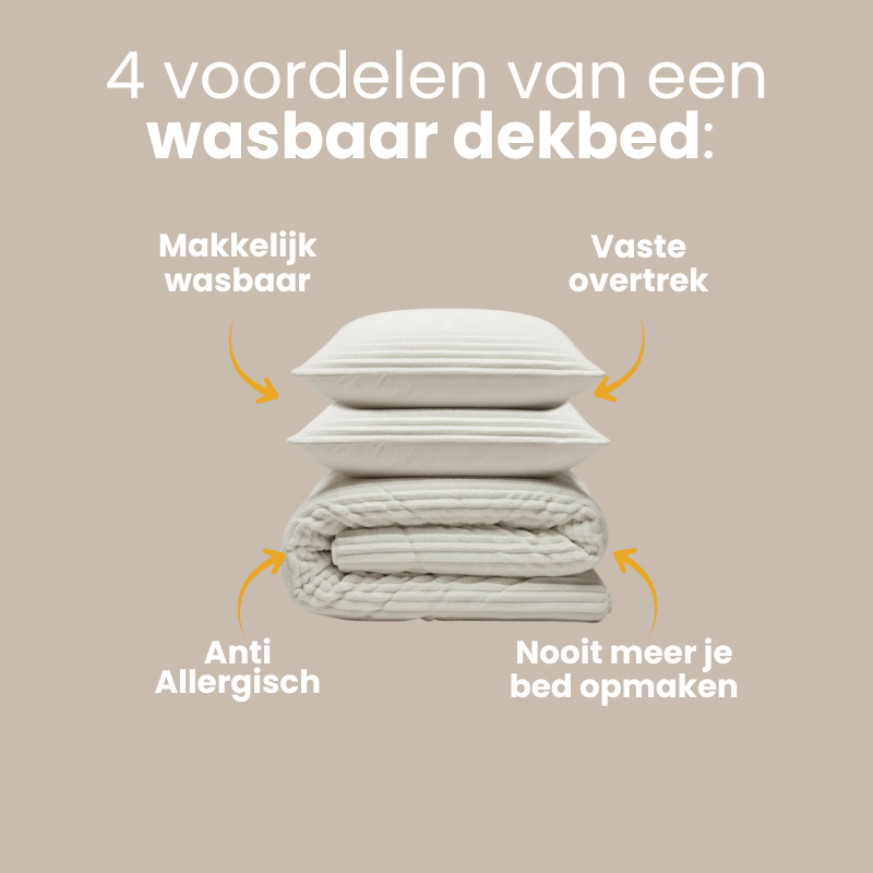 Ook op het gebied van hygiëne biedt een dekbed zonder overtrek duidelijke voordelen. Het volledige dekbed kan in de was, waardoor zweet en bacteriën in één keer worden verwijderd, en doordat je minder wasgoed en textiel nodig hebt, bespaar je ruimte en kosten zonder in te leveren op stijl.