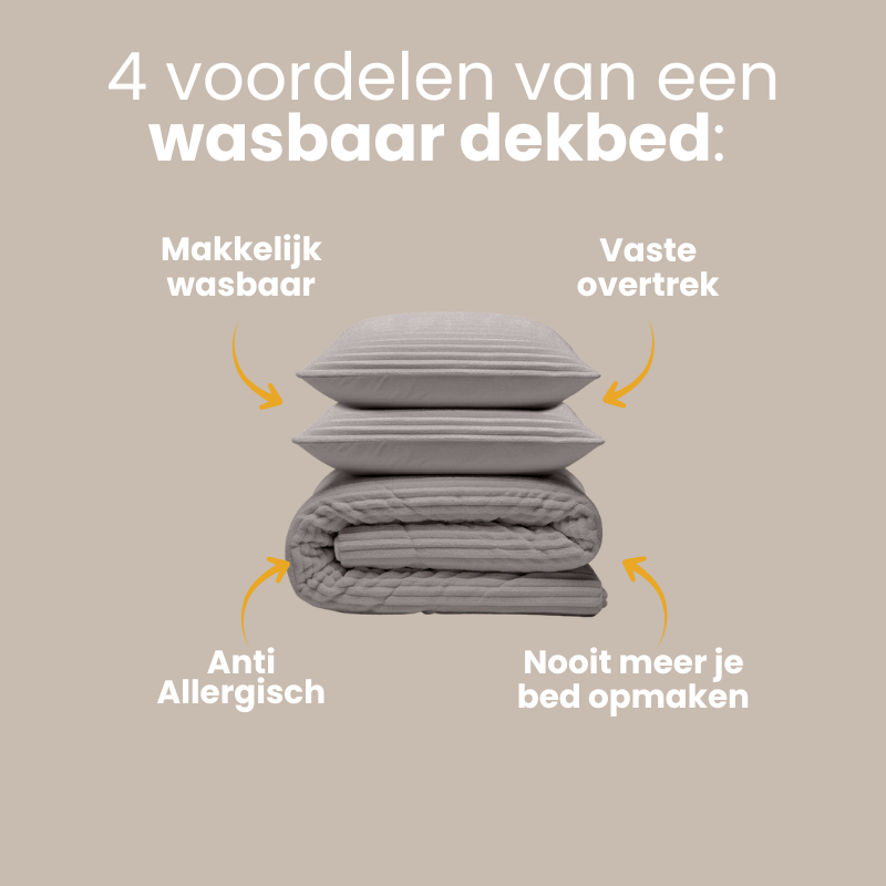 Ook op het gebied van hygiëne biedt een dekbed zonder overtrek duidelijke voordelen. Het volledige dekbed kan in de was, waardoor zweet en bacteriën in één keer worden verwijderd, en doordat je minder wasgoed en textiel nodig hebt, bespaar je ruimte en kosten zonder in te leveren op stijl.
