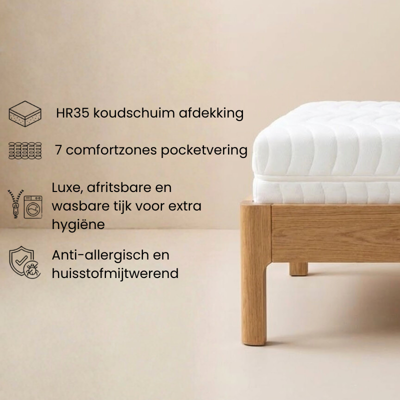 Het Matras Hilton bestaat uit een kern van pocketveren, verdeeld in 7 comfortzones die zich aanpassen aan jouw lichaam. De afdeklaag van HR koudschuim zorgt voor extra comfort en een goede vochtregulatie. De luxe tijk is afritsbaar en wasbaar op 40°C, zodat je het matras eenvoudig fris en schoon houdt. Dankzij de hoogwaardige materialen blijft het matras lang in topconditie.