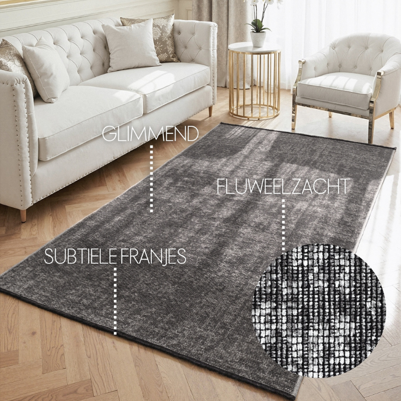 Het Vloerkleed Brilliance in grijs brengt een vleugje glamour en luxe in elke ruimte. Dankzij het subtiele glanseffect en het moderne ontwerp is dit vloerkleed een stijlvolle toevoeging aan ieder interieur.