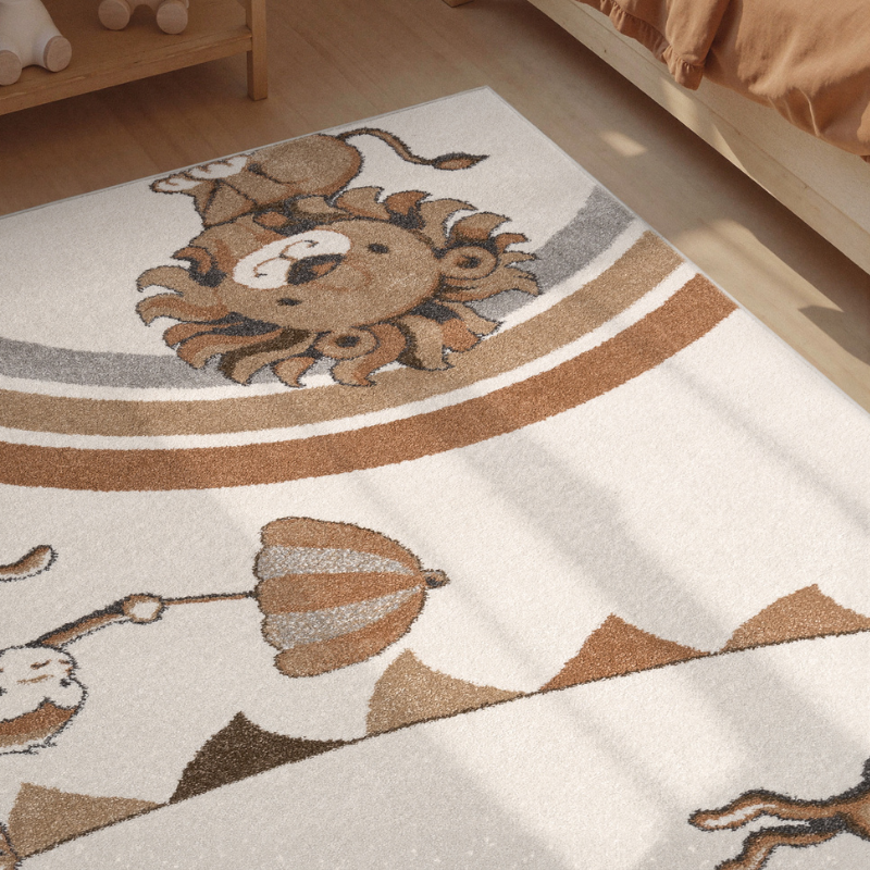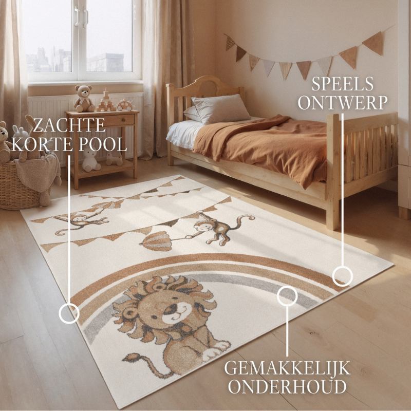 Dit vloerkleed combineert een vrolijk ontwerp met praktische eigenschappen zoals duurzaamheid en eenvoudig onderhoud. Het zorgt voor een warme en veilige speelplek voor kinderen en voegt tegelijkertijd een speels accent toe aan het interieur.